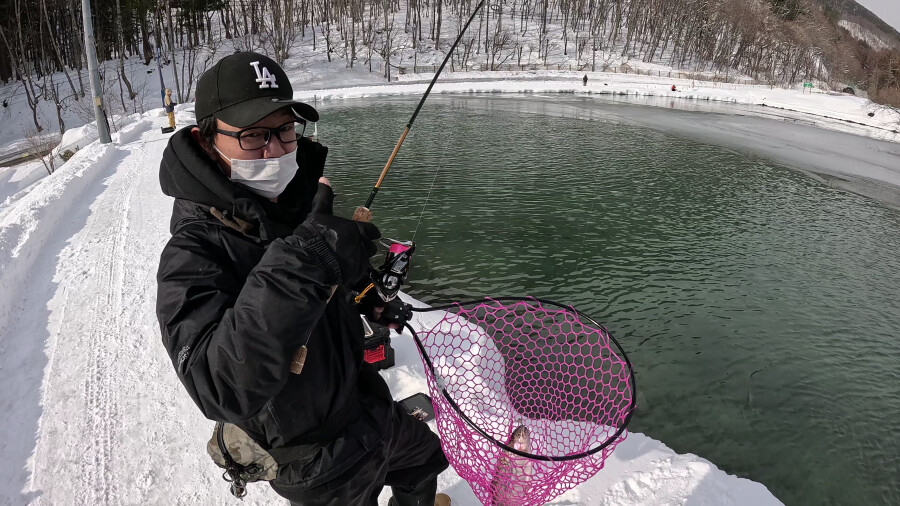 すると何と1投目でHIT!この時ドラグが緩すぎてあたふたしましたがスタッフ辻へタモ入れを頼み何とかゲット!釣れたのは...