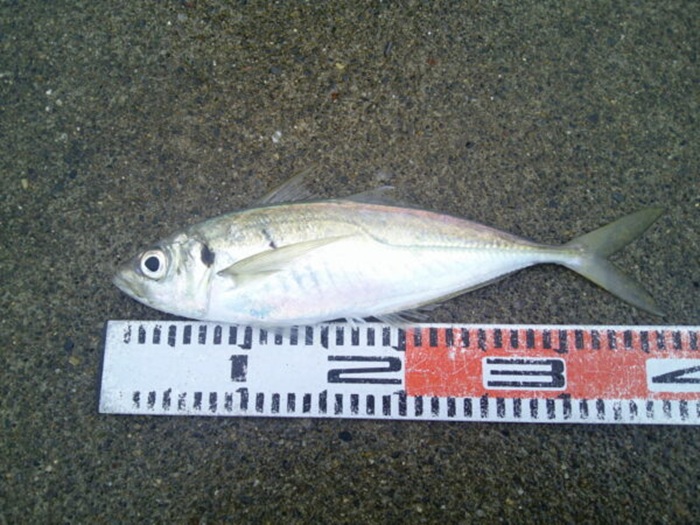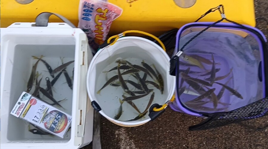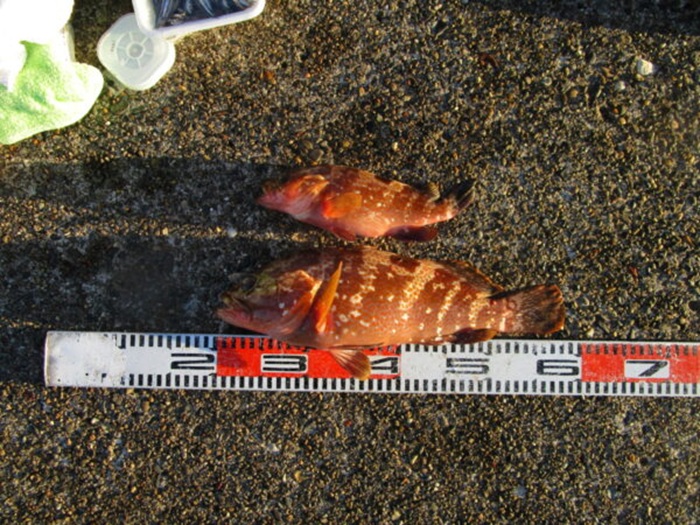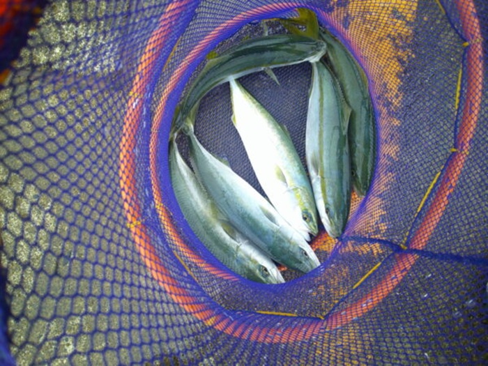 日中は小さいフグが多いので浮かず下の方にいます。サビキの針は3号、4号がいいと思います。下の写真は筒石で中アジ狙いで