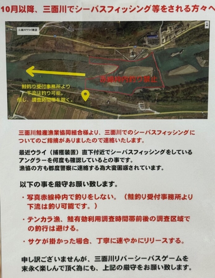 ※ウライから下流のサケ釣り受付事務所辺りまではシーバスフィッシングであっても釣り禁止区域となっておりますのでご注意ください。