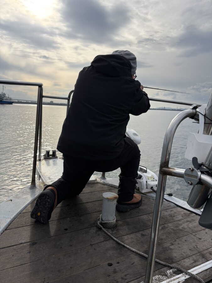 新釣法開発の様子。スナイパー釣法をリスペクトするあまりゴ○ゴ13になっておられる・・・