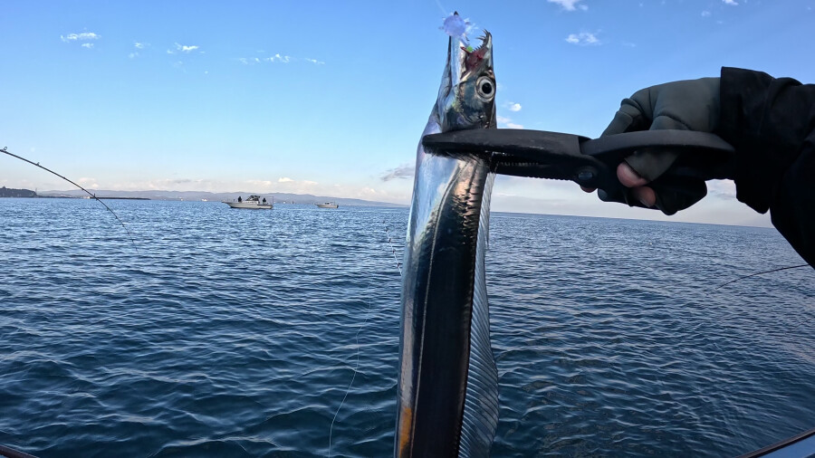 次に釣り上げたのはスタッフ辻!!銀色に輝くタチウオ!これは嬉しい外道!