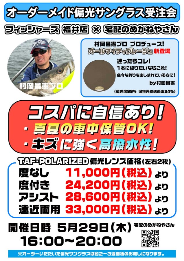 本日フィッシャーズ福井店でオーダーメイド偏光サングラス受注会を開催します