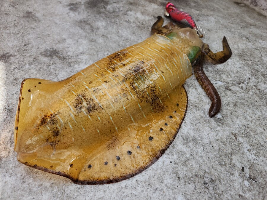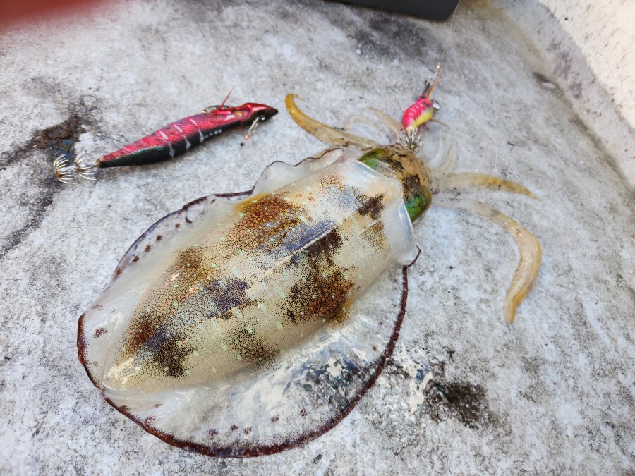 予想以上の風とウネリで釣りづらい状況でしたが、船中では31匹、この日最大は胴長29cm/940gとキロには届かないものの、平均サイズは胴長20㎝半ばが多数。私は最大胴長22cmを7匹でした。水深は46m~時には50m越えを流し良型がヒットしています。仮面シンカーや重いエギを多数用意されると良いと思います。
