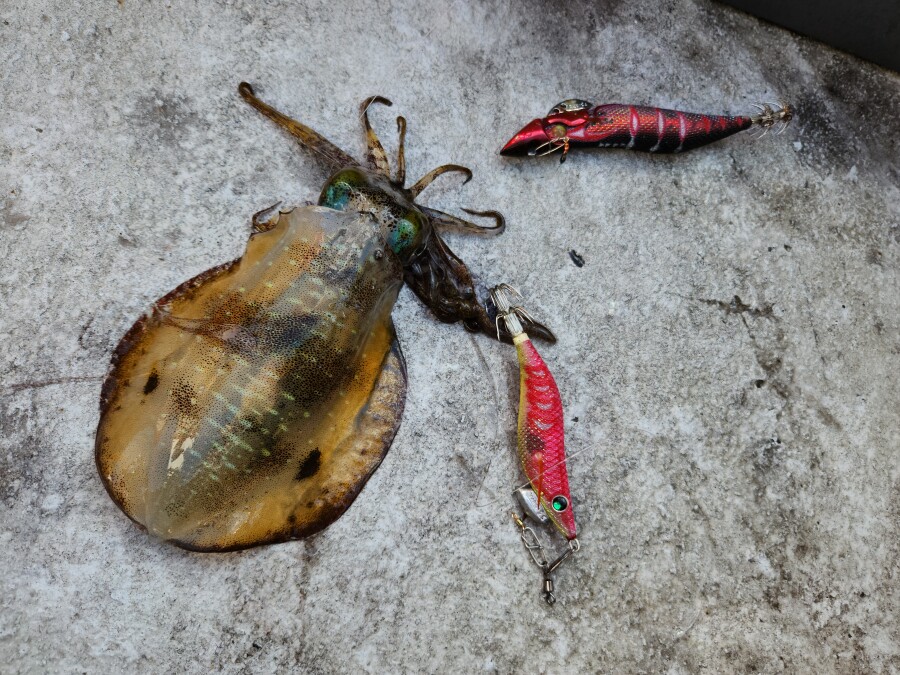 後半、船の流れも遅くなったところで「お助けリグ」を投入すると、これまで反応しなかったアオリイカが上部に付けたアオリーQ2.5に反応、(下部のティップラン用エギの70cm上にスイベルで装着)3匹追加出来ました。