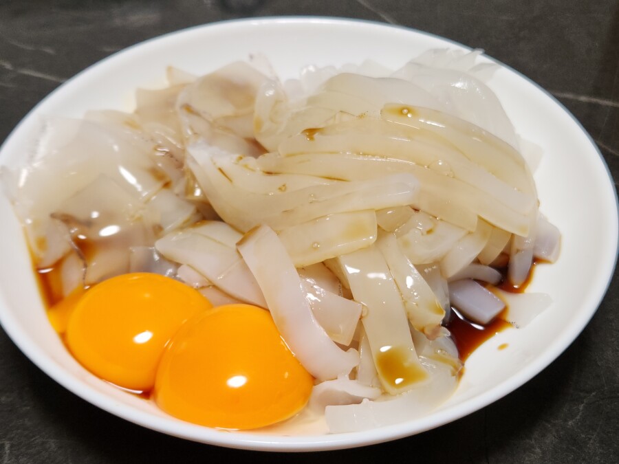 釣ったアオリイカをその日に頂きました。お刺身に卵黄を添えて出汁醬油をかけて出来上がり。出汁醬油は村上は塩谷の奈良橋醬油です。