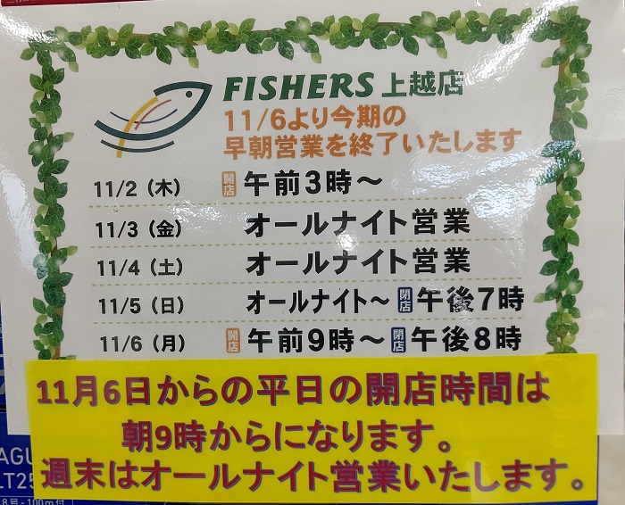 【上越店】11月の営業時間とシーバス、黒鯛、イカ釣行