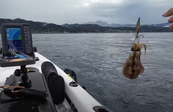 HONDEX魚探の等深線を見ながら、ここ等へんかな?とイメージを膨らませながら流してるとイカヒット。