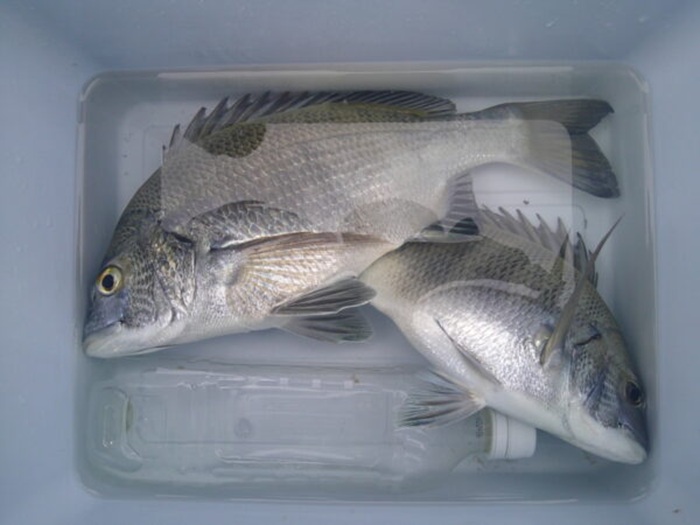 日中は小さいフグが多いので浮かず下の方にいます。サビキの針は3号、4号がいいと思います。下の写真は筒石で中アジ狙いで