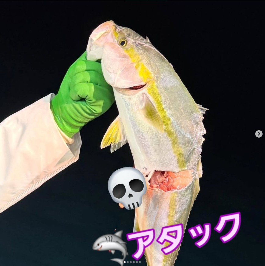 魚掛かる→サメに変わる サメ、サメサメサメ