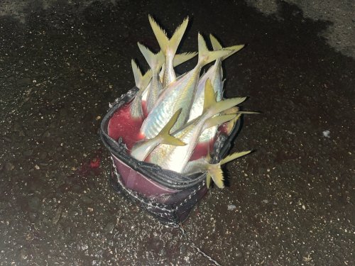 投げた後さかなしめるがんに置き竿したらガガガガって、表層の鯖入れパクしたみたいで竿持って海の中へ。