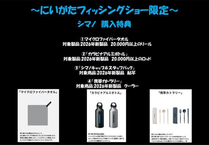 『SHIMANO』 来場予約特典【シマノ来場予約特典】※以前お知らせしていた内容と一部変更になりました。①マイクロファイバータオル プレゼント対象製品:2026年新製品 フィッシングショー販売価格20,000円(税込)以上のリール②カラビナアルミボトル」プレゼント対象製品:2026年新製品 フィッシングショー販売価格20,000円(税込)以上のロッド③「シマノキャップ&スタッフバック」プレゼント対象商品:2026年新製品 鮎竿④携帯カトラリー」プレゼント対象商品:2026年新製品 クーラーBOX