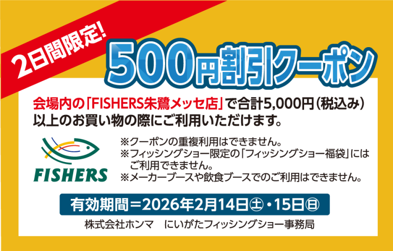特典: 会場内「FISHERS朱鷺メッセ店」で合計5,000円(税込)以上お買い上げで500円割引