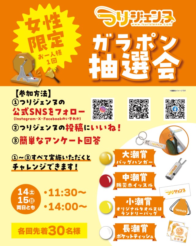 『つりジェンヌ』 ブース内イベント【女性限定!SNSフォローでガラポン抽選会】①つりジェンヌの公式SNSをフォロー②つりジェンヌの投稿にいいね!③簡単なアンケートに回答①~③をしていただいた方がガラポンにチャレンジできます。