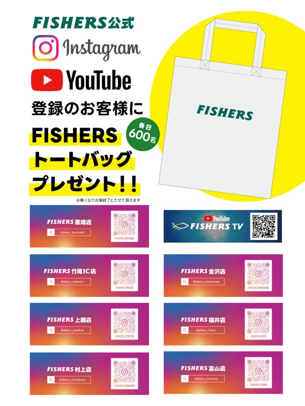 『FISHERS』 【FISHERS公式SNSフォローキャンペーン】FISHERS各店舗の「Instagram」と「FISHERS公式YouTubeチャンネル」いずれかにご登録いただいた方又は、既にご登録いただいている方に「オリジナルトートバッグ」を各日先着600名様にプレゼントいたします。スマホのフォロー画面を確認します。※Bステージ正面の「ホワイトスパイダー・ヴァサロ」ブース隣です!