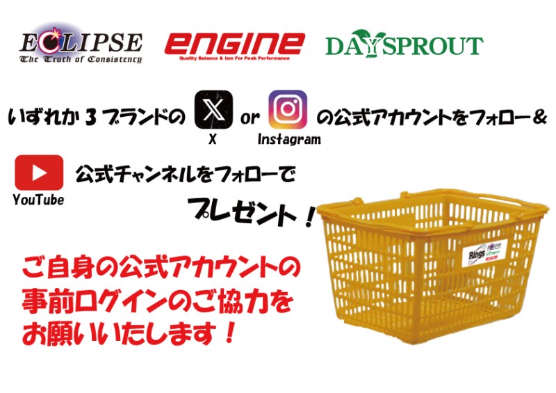『Rings』 ブース内イベント【Ringsショッピングバスケット プレゼント】ECLIPSE、ENGINE、DAYSPROUTいずれか3ブランドの「X(エックス)」「Instagram」公式アカウントをフォロー&「YouTube公式チャンネル」をフォローでRings限定ショッピングバスケットをプレゼントします。※両日ともに数量限定、先着順でのお渡しになりますので御注意ください。