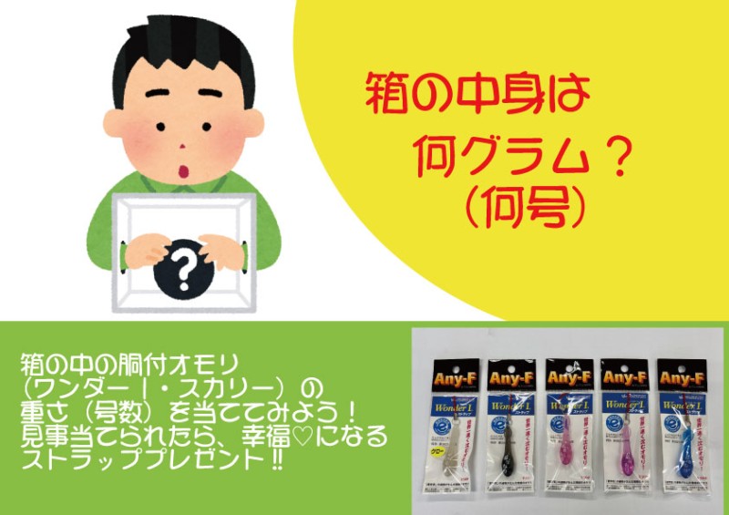『株式会社フジワラ』 ブース内イベント【箱の中身は何グラム(何号)?】箱の中にある胴付オモリ(ワンダー1・スカリー)の重さ(号数)を探って当ててみよう!見事当てられたら幸福になるストラッププレゼント!