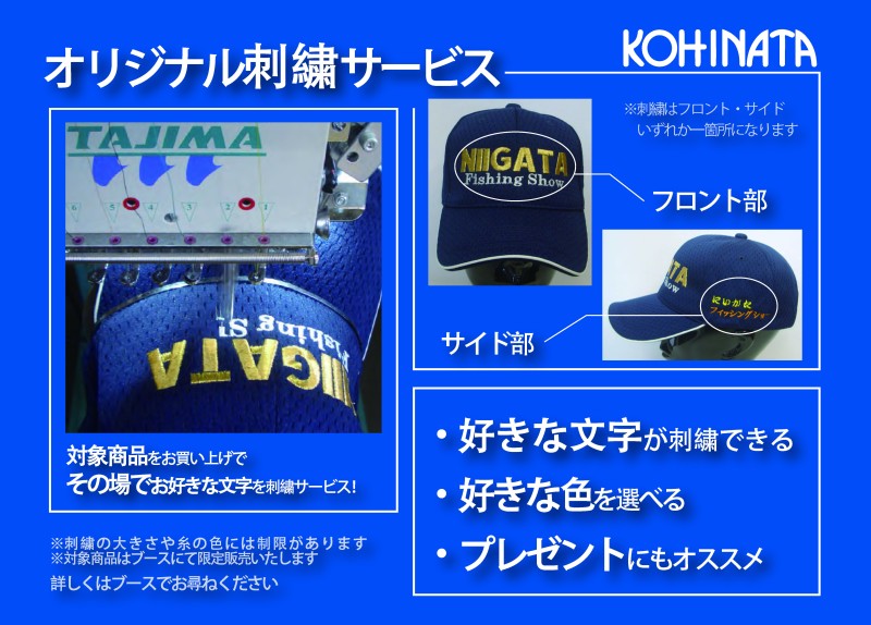 『KOHINATA』 ブース内イベント【帽子の刺繍サービス】KOHINATAブースで販売している指定の帽子をお買い上げいただいた方に、チーム名・個人名などを刺繍加工致します。※刺繍は1か所まで。自分だけのオリジナル帽子が作れます。