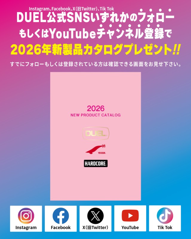 『デュエル』 ブース内イベント【SNSフォローで2026カタログプレゼント】公式SNS(X/Facebook/Instagram/TikTok)をフォロー又は,、公式YouTubeチャンネル登録のいずれかをしていただいた方に2026年新製品カタログをプレゼント。既にフォロー・登録済みの方は確認できる画面を提示して下さい。