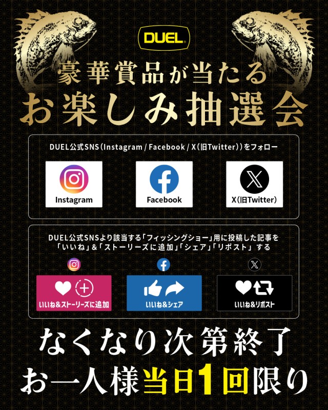『デュエル』 ブース内イベント【豪華景品の当たるガラポン開催】当社公式SNS(X/Facebook/Instagram)のいずれかをフォローしていただき、にいがたフィッシングショー用に当社が投稿した記事をリポストもしくはシェアしていただいた方が参加できる「お楽しみ抽選会」を開催いたします。※無くなり次第終了・お一人様1回限り