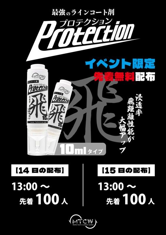 『MTCW』 ブース内イベント【Protectionミニサイズプレゼント】公式SNSをフォロー又はLINE登録で、ラインコーティング剤Protectionミニサイズプレゼント2/14日(1日目)13:00より配布開始・限定100本2/15日(2日目)13:00より配布開始・限定100本
