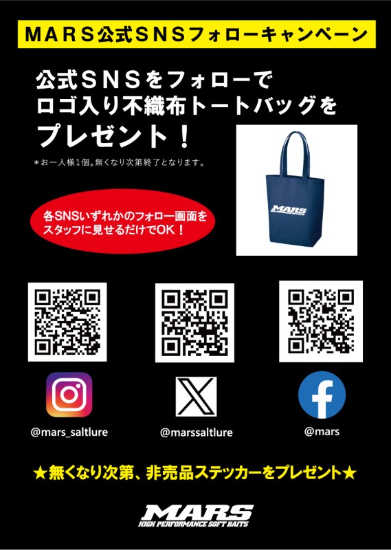 『MARS』 ブース内イベント【SNSフォローキャンペーン】公式SNSをフォローしてフォロー画面をご提示いただくとオリジナル不織布バッグをプレゼント。限定数につき、無くなり次第非売品ステッカーをプレゼント