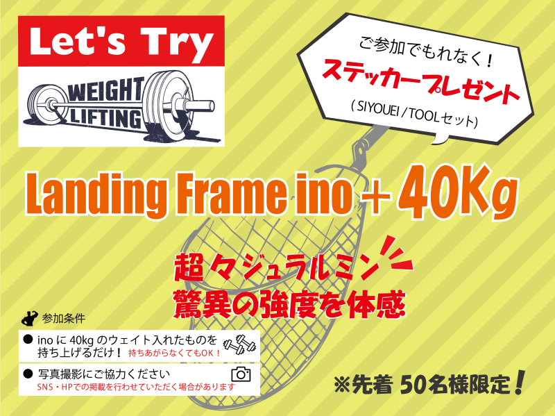 『昌栄/TOOL』 ブース内イベント【ランディングフレーム「ino」耐久テスト】inoのネットの中に40kgのウエイトを入れ、お客様にリフトしていただきます。リフトの様子を撮影させていただいた方にステッカーセットをプレゼント!※先着50名様限定です。撮影画像はSNSに使用させていただきます。なお、リフトは上がらなくても問題ございません。