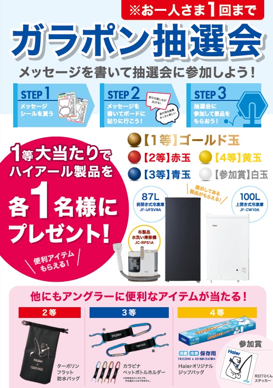 『Haier』 ブース内イベント【ガラポン抽選会】「釣り用冷凍庫、持ってる?欲しい?」このテーマに関するメッセージを書いてボードに貼ると、ガラポン抽選会に参加できます。どなたでも参加可能・参加無料です。1等大当たりでは、ハイアール製品を各1名様にプレゼント!~プレゼント商品~・100L 上開き式冷凍庫・87L 前開き式冷凍庫・布製品水洗い掃除機そのほかにも便利なアイテムが当たります。ハズレはありません。無くなり次第終了。※クイズ大会時は実施しておりません。