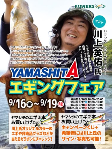17日(土)にフィッシャーズ金沢店にて「ヤマシタ エギングフェア」を開催します! エギングマイスターの「川上 英佑」さんも来店します。
