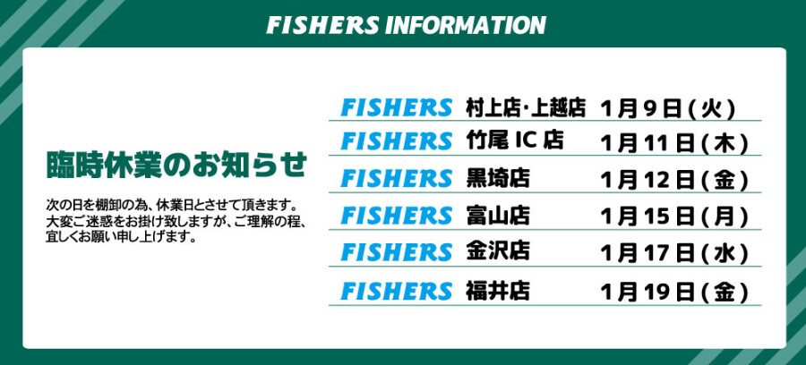 1月17日(水)に棚卸の為フィシャーズ金沢店は臨時休業致します。なお、18日以降は通常営業致しますのでお間違えのないようお願い致します。