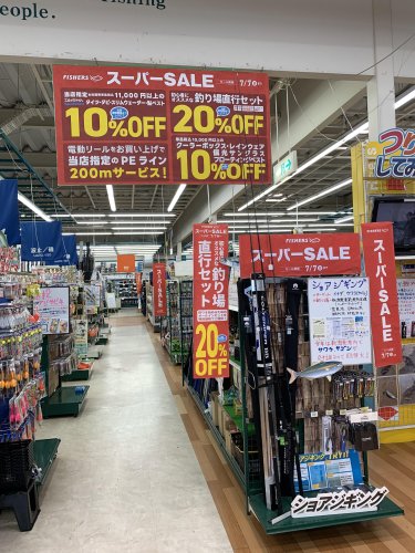 フィッシャーズ竹尾IC店の大関です。 只今FISHERS スーパーセール開催中です!! 鮎用品をはじめ旬なアイテムが盛り沢山!! 7月7日までになりますのでぜひこの機会にご来店ください!! 皆さまのご来店お待ちしております。
