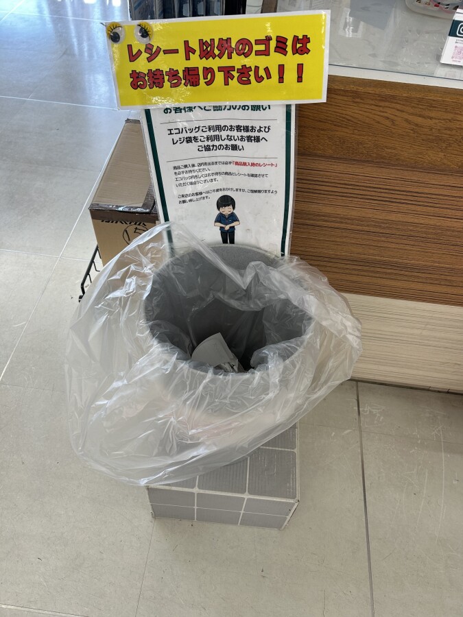 レジ前にレシート専用のゴミ箱を設置しております。お買い物の際、不要でしたらこちらに入れるようお願い致します。