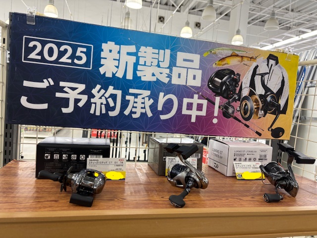 2025年新製品のご予約を受け付け中です! 店内に今年のダイワ新製品を一部展示しております! もちろん触ることも可能ですので、購入検討の参考にしてみてはいかがでしょうか?