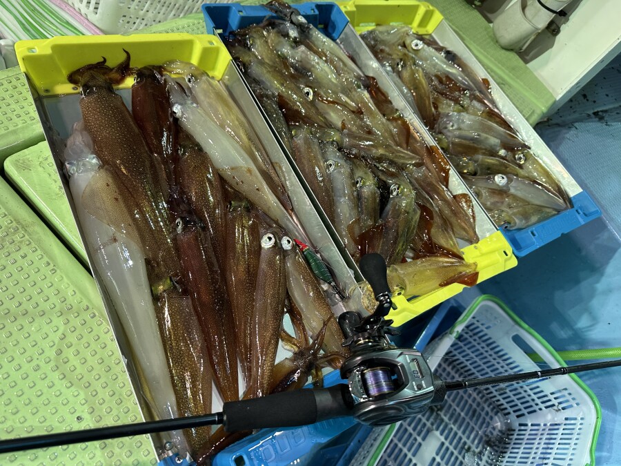 20時少し前くらいから、マイカ(ケンサキイカ)が混じり始め、20時以降はほぼほぼマイカラッシュでした。前半は落とし込みでの反応が良く入れ掛りでしたが、風向きが変わり船の向きが変わってからは、ロングステイでの拾い釣りになり失速。それでも49杯と大満足の釣行となりました!