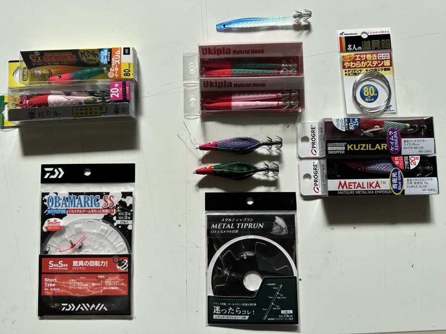 16時出船の半夜便での釣行。ポイントは40m弱の浅場で、イカメタルにはちょうど良い水深です。タックルは2セット用意。片方はシングルドロッパーのマイカ仕様、もう一方はダブルドロッパーのヤリイカ仕様です。ヤリイカメタルでは、プラヅノ、エサ巻きスッテも多用します。ちなみに、当日は潮が緩かったので15~20号の錘スッテを使用しました。