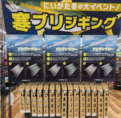 今シーズンのブリジギングはフィッシャーズ村上店オリカラの「ドンテングロー」で釣って頂き、曇天の中、晴れやかな笑顔で寒ブリを持った皆様の写真を見られる事を切に願っております!
